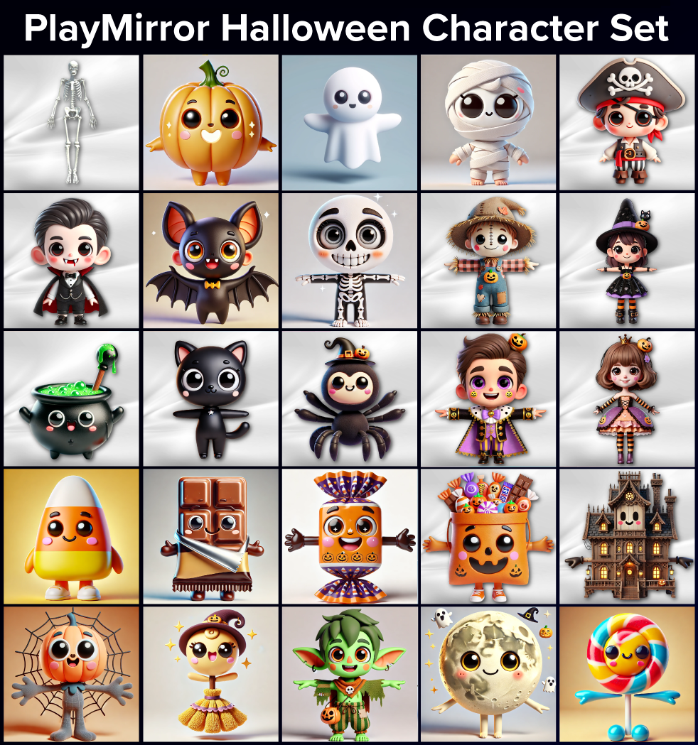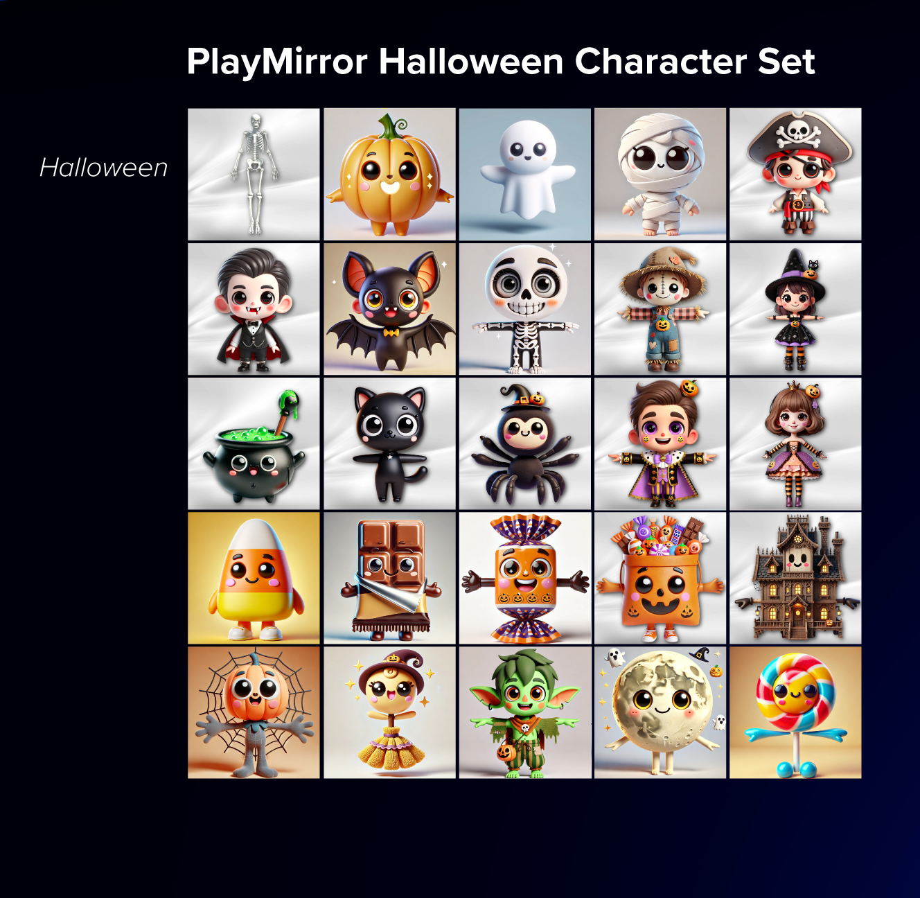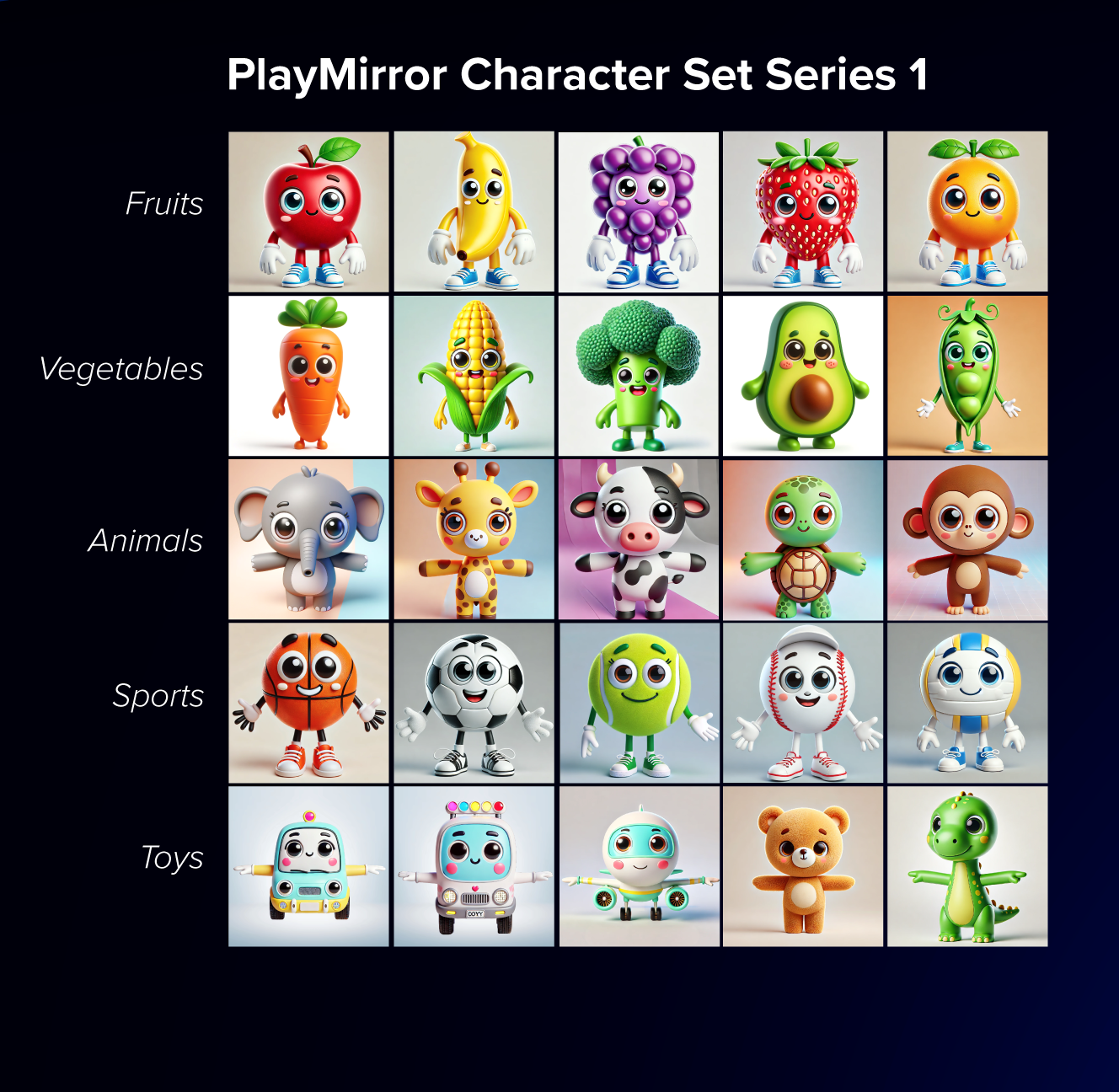There are hundreds of Characters that you’ll be able to play with in the PlayMirror! They include fun themed characters for holidays like Halloween and Thanksgiving, characters for special occasions like Birthdays, and amazing and engaging characters to play with every day like Fruits, Vegetables, Animals, Sports, and Toys! You’ll love them all!